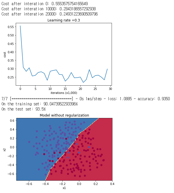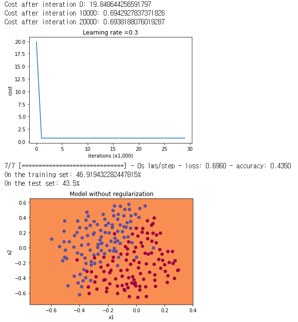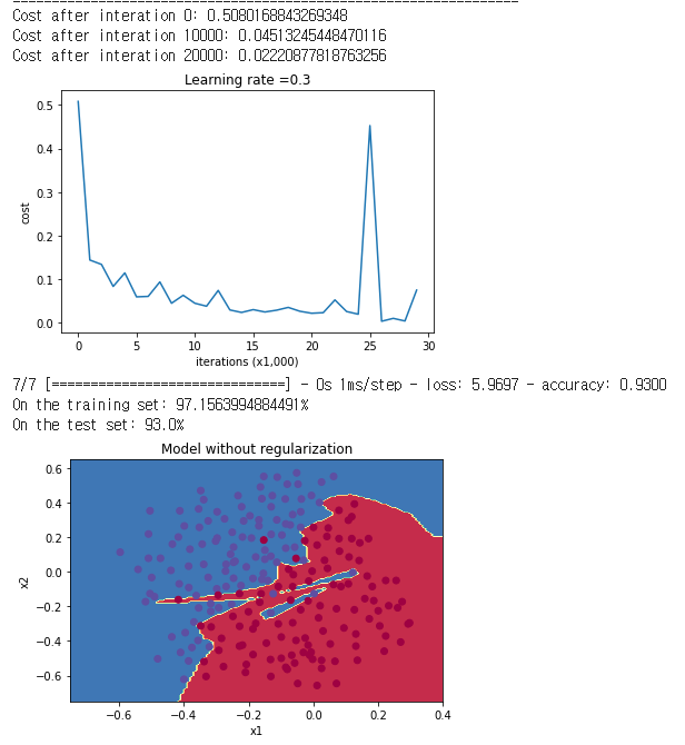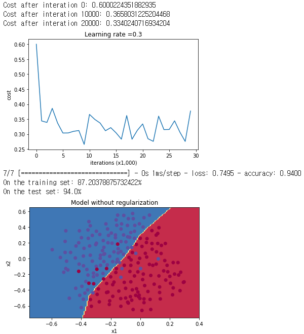 시작하기에 앞서 말씀드린대로 1)regularization을 적용하지 않은 경우, 2)L2 regularization을 적용한 경우, 3)Dropout을 적용한 경우, 이 3가지 방법으로 각각 학습해볼 것입니다. 각 regularization에 대해서는 아래 글을 참조하시기 바랍니다.