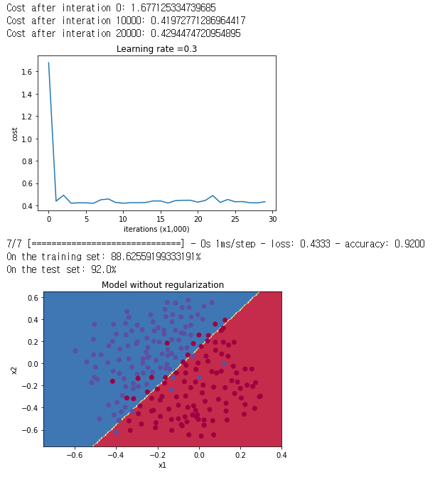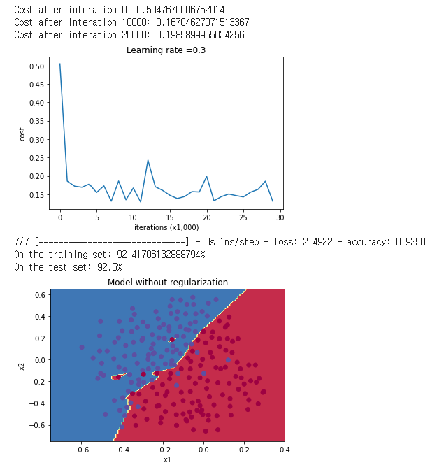 확실히 Non-regularized나 L2 regularization과 비교해서 좋은 결과지만, Decision Boundary를 봐서는 무언가 약간 overfitting의 느낌이 조금 나고 있습니다. keep_prob의 비율에 따라서 어떻게 다른지, 비율을 다르게 해서 학습을 더 해보도록 하겠습니다.