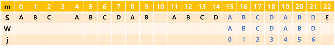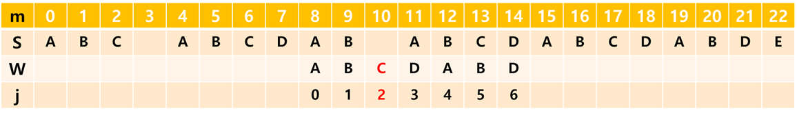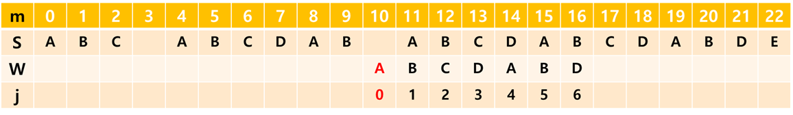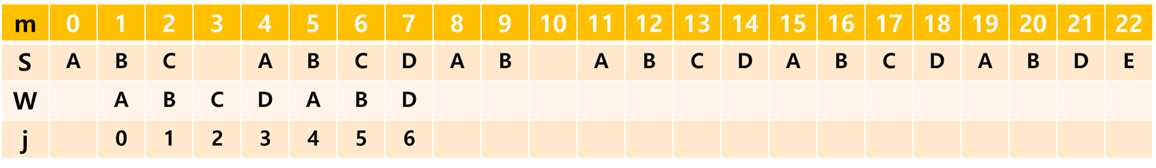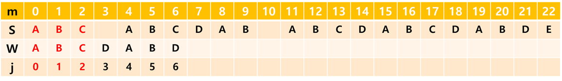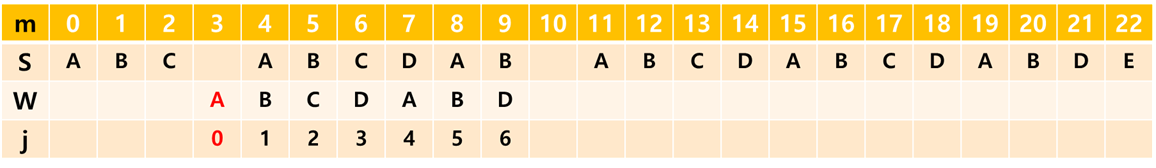 (여기서 m은 문자열 S의 인덱스, j는 문자열 W의 인덱스입니다.)