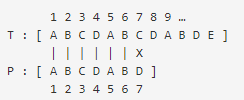 string T, P;