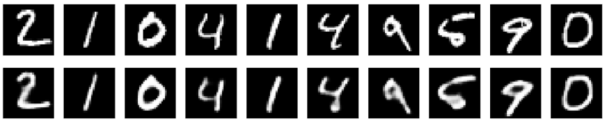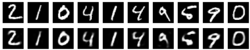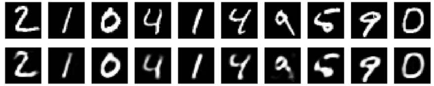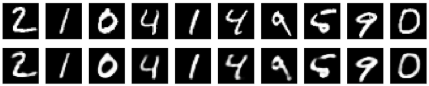 위의 줄이 원본 데이터이고, 아래 줄이 오토인코더를 통해 재구성된 데이터입니다. 간단한 모델로는 꽤 손실이 있음을 볼 수 있습니다.
