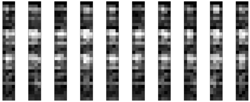 또한, 인코딩된 데이터도 살펴볼 수 있습니다. 인코딩 데이터의 차원은 (8,4,4) 이기 때문에, grayscale로 (4,32)로 reshape해서 표현해보도록 하겠습니다.