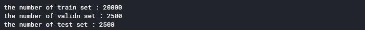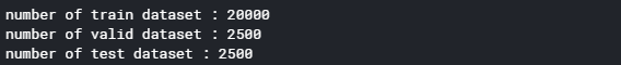 train/valid/test용으로 각 20,000/2,500/2,500개의 이미지로 분배했습니다.