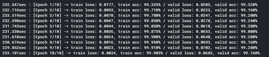 print(f'{time.time() - start:.3f}sec : [Epoch {epoch+1}/{epochs}] -> train loss: {train_loss/len(train_loader):.4f}, train acc: {train_acc*100:.3f}% / valid loss: {valid_loss/len(valid_loader):.4f}, valid acc: {valid_acc*100:.3f}%')