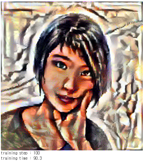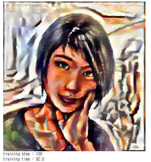 그리고 content loss와 style loss의 비중을 정의하고, loss를 정의합니다. Loss는 타겟에 대한 입력 이미지의 평균 제곱 오차(MSE)를 계산하고, 오차들의 가중합으로 계산됩니다.