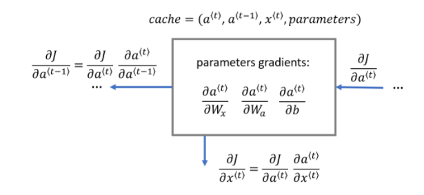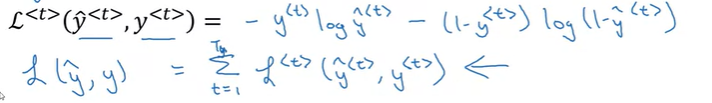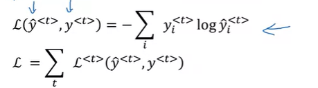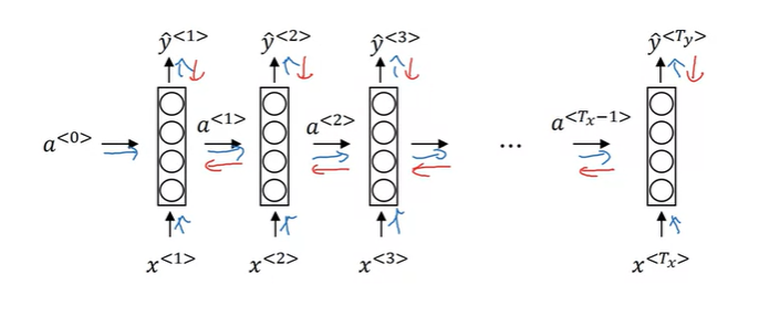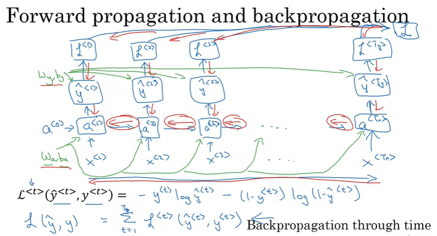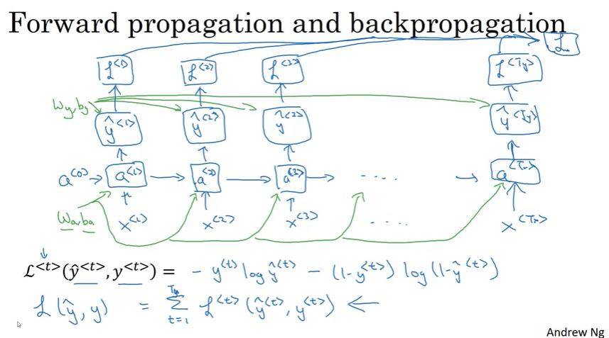 일단 이전 강의 내용에서 살펴봤듯이, \(W_a, b_a\)를 통해서 \(a^{<t>}\)를 구하고, \(W_y, b_y\)를 통해서 예측값 \(\hat{y}^{<t>}\)를 구한다.