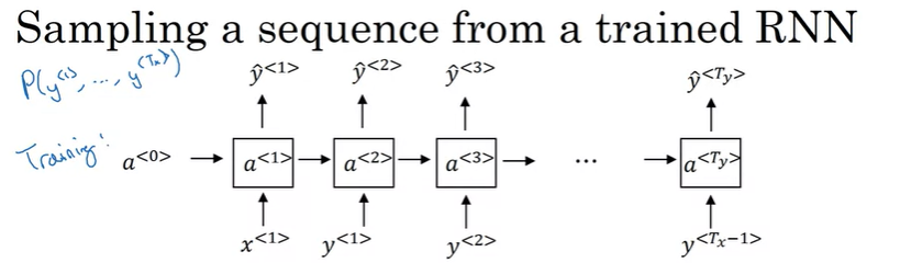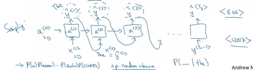 \(a^{<0>}, x^{<1>}\)는 0 vector이고, 첫 번째로 softmax output \(\hat{y}^{<1>}\)를 출력한다. 이것은 각 단어의 확률이 얼마나 되는지 알려주는데, 이 벡터를 사용해서(numpy의 np.random.choice를 통해) 무작위로 첫 번째 단어를 샘플링 할 수 있다. 그런 다음 두 번째 단계로 넘어간다. 두 번째 단계에서는 샘플링한 값을 \(x^{<2>}\)로 사용한다.
