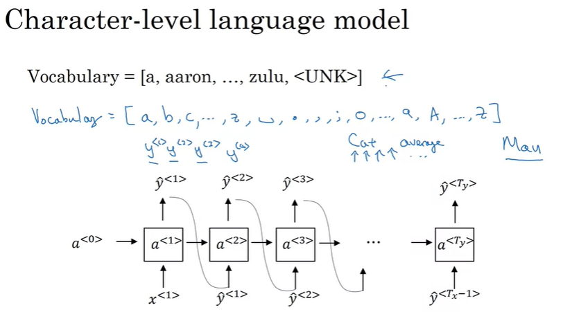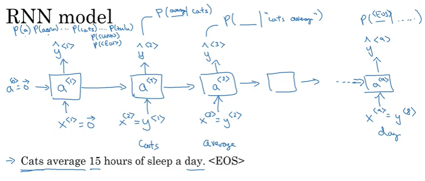 여기서 \(\hat{y}^{<1>}\)는 softmax output이며, 첫 번째 단어가 존재할 확률을 의미한다. 이 예제에서는 첫 번째 단어 cats가 될 것이다.