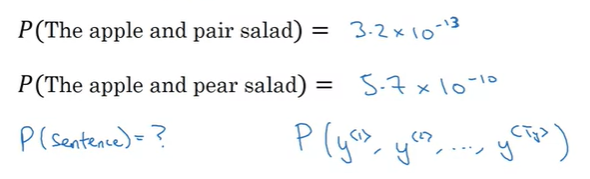 세 개의 단어를 가지는 문장으로 정리해보자면, 첫 번째 단계에서 softmax output은 \(y^{<1>}\)의 확률을 알려주고, 두 번째는 이전 단어가 \(y^{<1>}\)일 때, \(y^{<2>}\)의 확률, 세 번째는 이전 단어가 \(y^{<1>}, y^{<2>}\)일 때, \(y^{<3>}\)의 확률을 알려주게 된다. 즉, \(P(y^{<1>}, y^{<2>}, y^{<3>}\)은 다음과 같다.