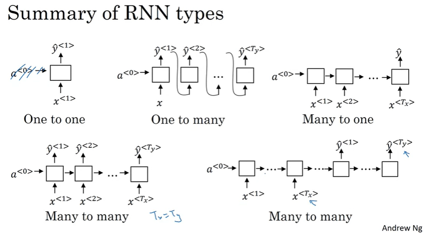 지금까지 RNN 아키텍처에서는 \(T_x\)가 \(T_y\)와 동일한 경우를 살펴보았다. \(T_x, T_y\)는 항상 같지 않을 수 있으며, 다양한 RNN 아키텍처를 살펴보도록 하자.