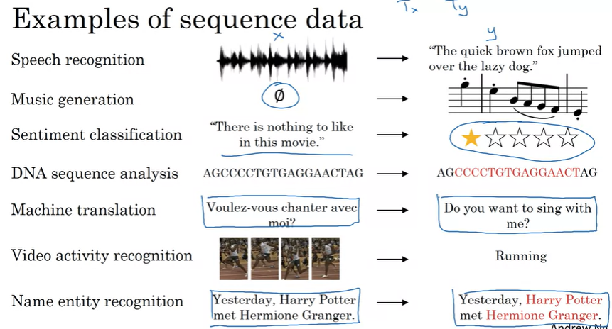 다섯번째 강의에서는 Sequence model에 대해서 배운다. 딥러닝에서 가장 흥미로운 분야 중 하나이며, Recurrent Neural Network(RNN)같은 모델은 음성 인식, 자연어 처리(NLP) 영역에 영향을 끼쳤다.