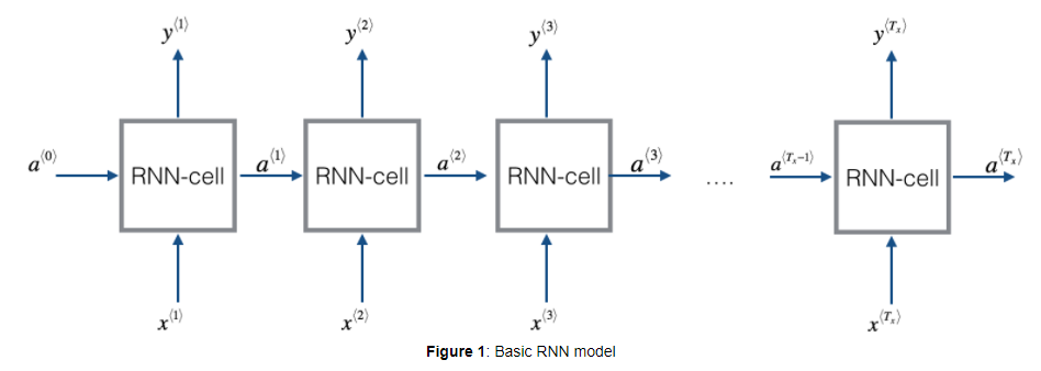 RNN의 기본 구조는 위와 같다. 좌에서 우로 문장을 읽는다면 처음 읽는 단어 \(x^{<1>}\)를 신경망의 입력으로 사용한다. 그리고 내부 신경망(hidden layer, output layer)를 통해서 사람 이름의 일부인지 예측한다.