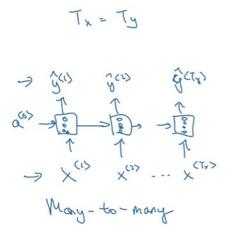 이전 예제들처럼, \(T_x = T_y\)라면 Many-to-many 아키텍처라고 하고, 아래와 같이 모델링할 수 있다.