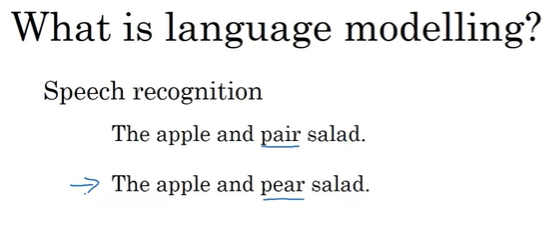 The apple and pear salad라는 문장을 들었을 때, 위 두 가지 문장이 있다면 두 번째 문장이 더 가능성이 있다고 생각할 것이다. 여기서 두 번째 문장을 선택하는 방법은 두 문장의 확률이 얼마인지 알려주는 언어 모델을 사용하는 것이다.
