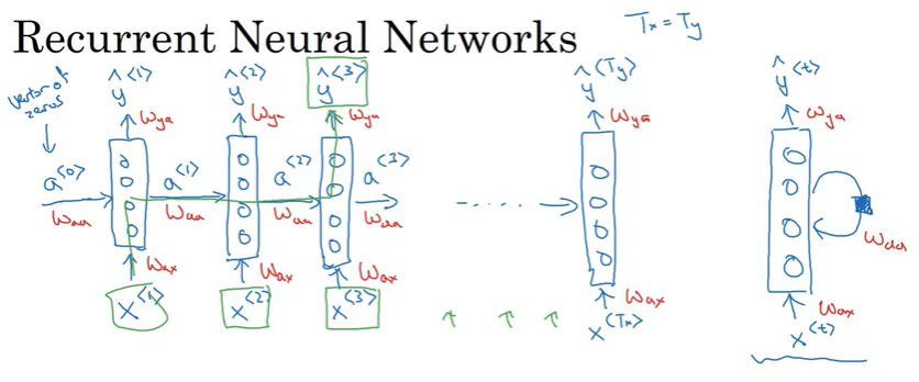 위 이미지 오른쪽처럼 하나의 NN만 표현하고 순환하는 표시로 RNN을 표현하기도 한다. 이는 매 시점에서 파라미터를 공유한다는 것을 의미한다. (\(W_{aa}, W_{ax}, W_{ya}\)가 사용됨)