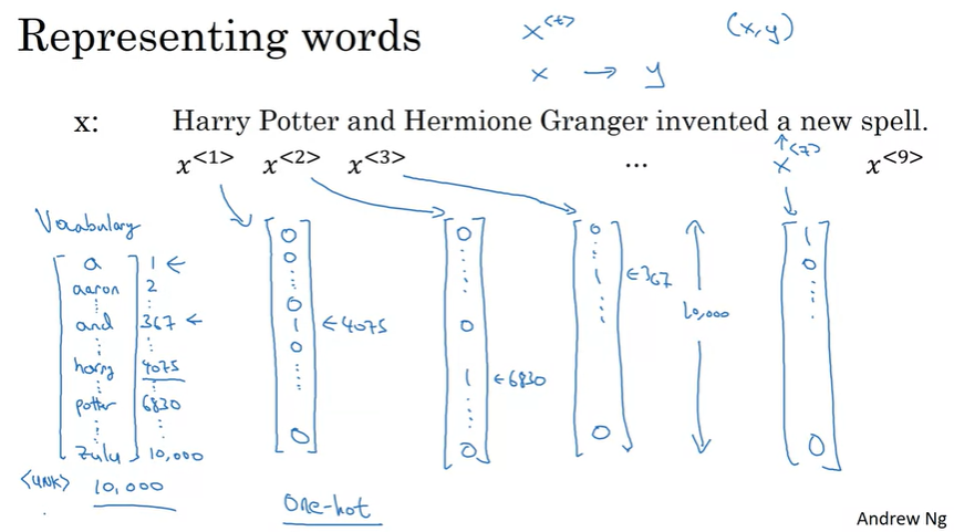 예를 들어, 'harry'를 나타내는 단어 \(x^{<1>}\)는 4075번째 위치만 1이고 나머지는 0인 벡터이다.(사전의 4075번째 위치가 'harry'이기 때문)