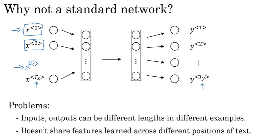 첫번째는 입력과 출력 데이터의 길이가 트레이닝 데이터마다 다르다. 모든 트레이닝 데이터가 같은 입력 길이 \(T_x\)를 가지지 않고, 같은 \(T_y\)를 가지지 않는다. 입력에 임의의 값이나 0으로 채워서 최대 길이로 동일하게 맞출 수는 있지만 좋은 방법은 아니다.