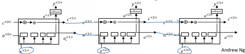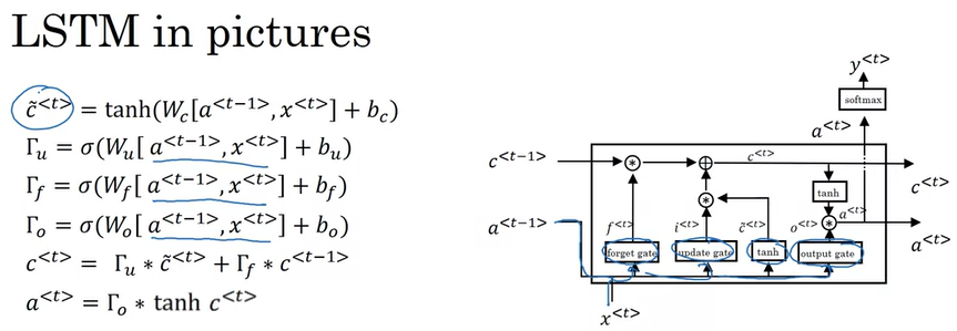 GRU보다 조금 더 복잡한데, 우선 이전 time step에서 전달받는 input이 \(c^{<t-1>}, a^{<t-1>}\)로 추가된다.