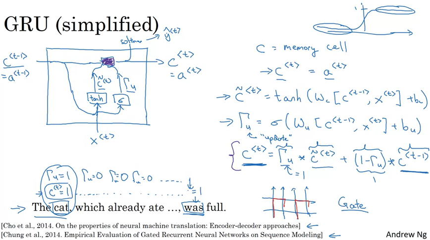 GRU를 간단하게 표현하면 위와 같다. 여기서 새롭게 나타나는 c는 memory cell을 의미하며 이전 정보들이 저장되는 공간이다. 이전 정보가 \(c^{<t-1>} = a^{<t-1>}\)를 통해 전달되고, 이전 정보와 현재 input \(x^{<t>}\)와 결합하여 다음 time step으로 전달된다.