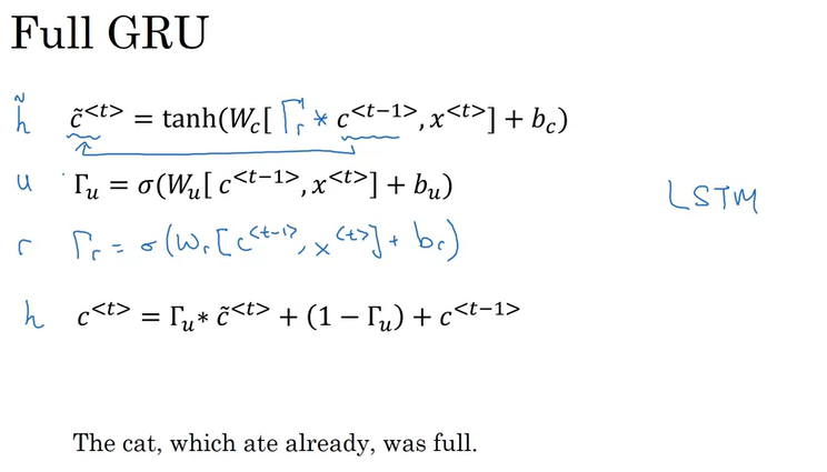 \[c^{<t>} = \Gamma_u \ast \tilde{c}^{<t>} + (1 - \Gamma_u) \ast c^{<t-1>}\]