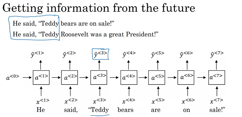 전에 살펴본 사람 이름을 찾는 모델에서의 예시이다. 위의 단방향 RNN 모델이 있을 때, 세번째 단어인 Teddy가 이름인지 아닌지 확인해보기 위해서는 첫번째, 두번째 단어만으로는 충분하지 않다. 즉, 더 많은 정보가 필요하다는 것이다.