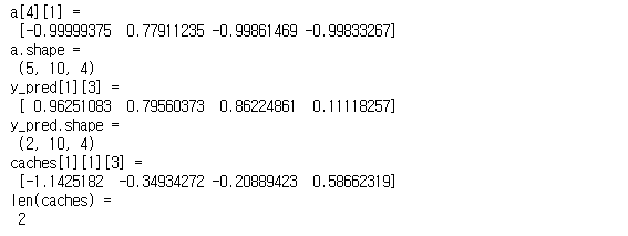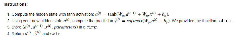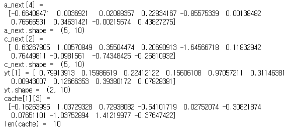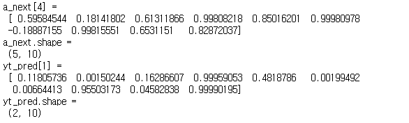 a_next_tmp, yt_pred_tmp, cache_tmp = rnn_cell_forward(xt_tmp, a_prev_tmp, parameters_tmp)