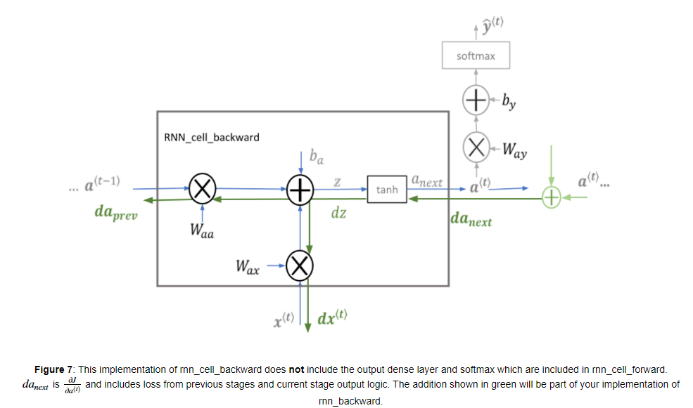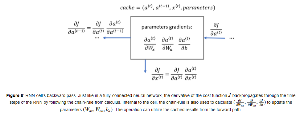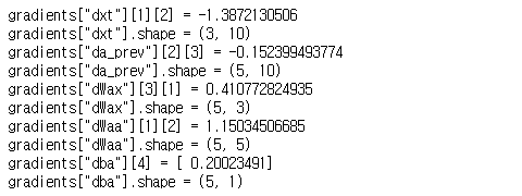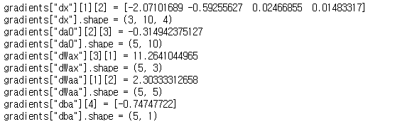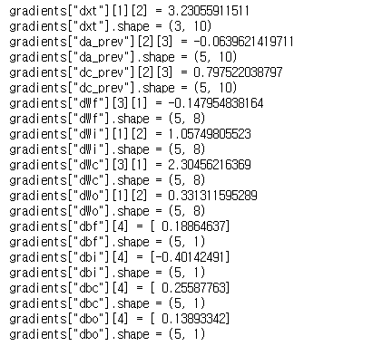 전체 Backward 과정은 rnn_backward 함수와 유사합니다. 마찬가지로 마지막 time-step부터 역으로 진행하면서 각 cell에서 미분값을 구하고, 파라미터를 업데이트하게 됩니다.