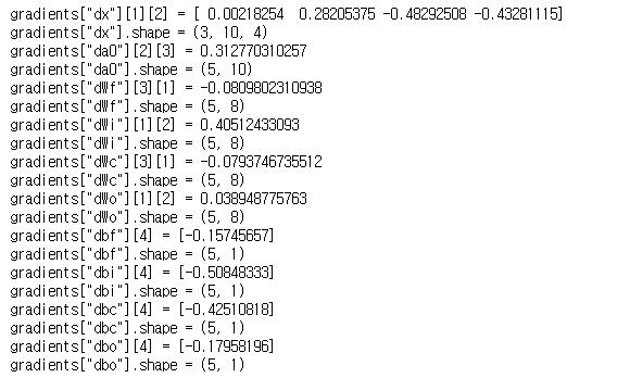 gradients = {"dx": dx, "da0": da0, "dWf": dWf,"dbf": dbf, "dWi": dWi,"dbi": dbi,