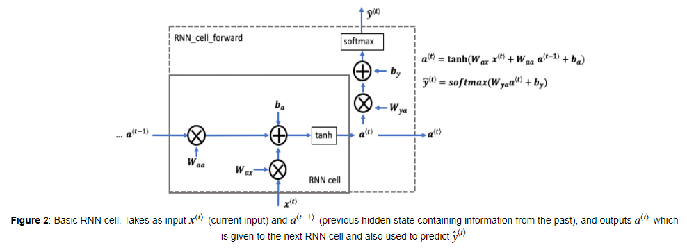 따라서, RNN cell 연산의 결과로 각 time-step의 hidden state \(a^{<t>}\), prediction \(\hat{y}^{<t>}\)를 반환합니다.