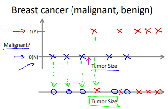 위의 그래프는 종양의 사이즈에 따른 악성(1)/양성(0) 여부이다. 이처럼 Classification은 분류의 문제이며, 아래 그래프와 같이 O, X로 x축으로만 표현도 가능하다.