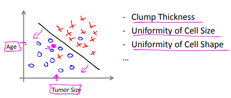 위 그래프는 나이 조건을 추가하여, 종양 사이즈와 나이에 따른 악성/양성 여부 그래프이다. 나이 외에도 종양 두께(Clump Thickness), 세포 사이즈의 균일성(Uniformity of Cell Size), 또는 세포 모양의 균일성(Uniformity of Cell Shape) 등의 조건도 추가할 수 있다.