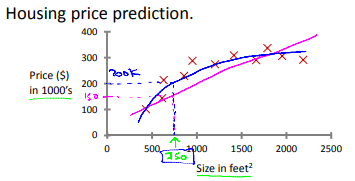 위의 주택 가격 예측 그래프를 살펴보자. x축은 집의 크기이며, y축은 가격을 의미한다. 그리고 우리에게 빨간색 X 표시로 data set이 주어졌다. 그리고 우리는 750 feet^2 집의 가격을 주어진 그래프에서 예측을 해보면 150,000 달러로 예측이 가능하다.