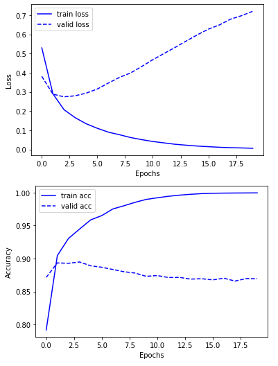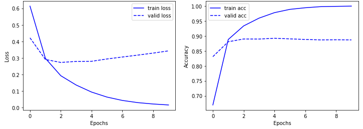 train data의 정확도는 거의 100%인 반면에, valid data의 정확도는 약 87%로 전형적인 과적합의 모습을 보여주고 있는 것 같습니다.