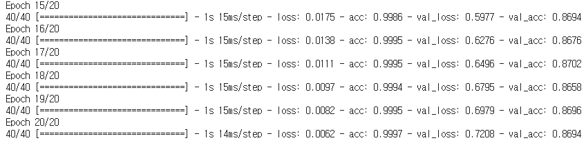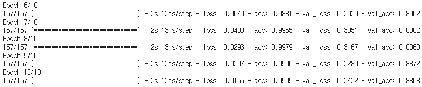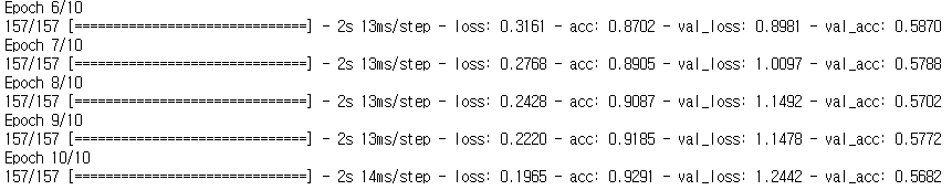 학습이 진행되면서 validation data의 loss가 증가하고 acc가 조금 감소하는것으로 보아 과적합이 진행되는 것 같습니다.