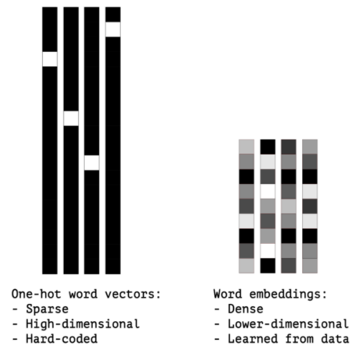 one-hot encoding과 다르게 단어 임베딩은 데이터로부터 학습되며, 더 적은 정보를 더 적은 차원에 저장합니다.