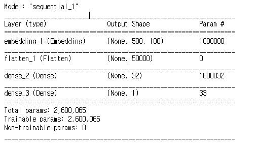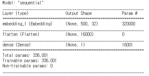 그리고 모델은 Embedding layer와 Dense layer로 구성되어 있습니다.