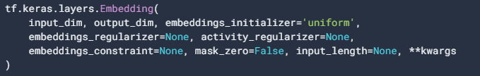 Embedding layer의 input_dim은 사용되는 voca의 차원이며, output_dim은 embedding feature의 개수입니다. 그리고 input_length를 통해서 입력받는 시퀀스의 길이를 설정합니다.