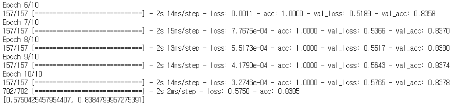 validation data의 정확도가 83%, test data의 정확도가 83%가 나왔습니다. 이 경우에는 해당 작업(리뷰 분석)에 특화된 입력 토큰의 임베딩을 학습했기 때문에 사전 훈련된 단어 임베딩보다 성능이 좋은 것으로 추측됩니다.