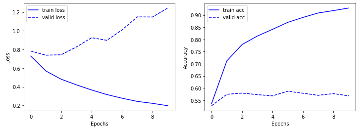 valid loss가 학습이 진행될수록 증가하고, valid acc가 감소하고 있는 것으로 보아 과적합 문제가 발생하고 있는 것으로 보입니다.