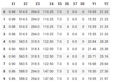 Data는 8개의 feature들이 입력과, 2개의 출력, Heating Load(난방부하), Cooling Load(냉방부하)로 이루어져 있습니다.