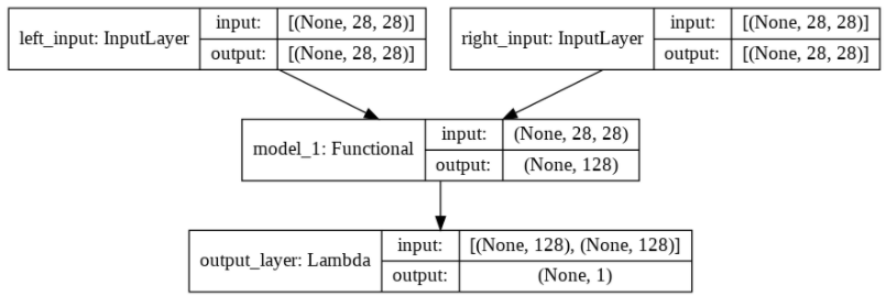 left_input과 right_input이 동일한 네트워크를 통과하고 있습니다. 그리고, Lambda layer를 통해서 두 vector output의 유클리디안 거리를 출력하게 됩니다.