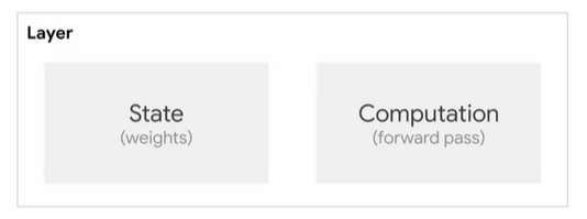 기본적으로 layer는 클래스이며 layer의 state인 parameter(weight)와 신경망에서 layer의 목적(입력->출력)을 달성하기 위한 Computation(forward pass)로 구성되어 있습니다.