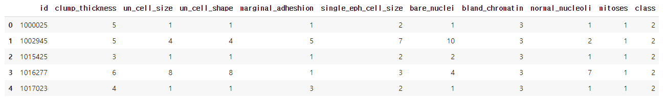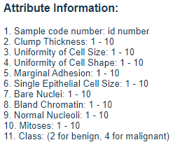 col_names = ["id", "clump_thickness", "un_cell_size", "un_cell_shape", "marginal_adheshion", "single_eph_cell_size", "bare_nuclei", "bland_chromatin", "normal_nucleoli", "mitoses", "class"]