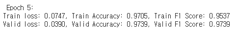 train과 valid dataset에서 모두 약 97%의 정확도와 0.95~0.97의 F1 Score를 얻었습니다.