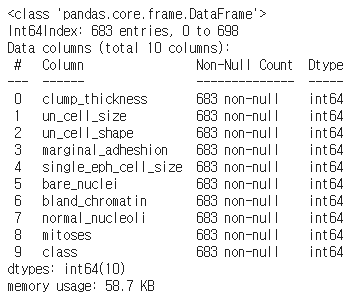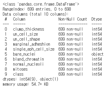총 699개의 samples이 있으며, 데이터를 살펴보면 bare_nuclei의 data type이 object인 것을 확인할 수 있습니다. 수치가 아닌 다른 타입의 정보가 있다는 의미입니다. 실제로 살펴보면 '?'라는 정보가 있으며, 학습시에 이 정보는 어떻게 처리할 지 애매하므로, bare_nuclei의 값이 '?'인 샘플은 제거하도록 합니다.