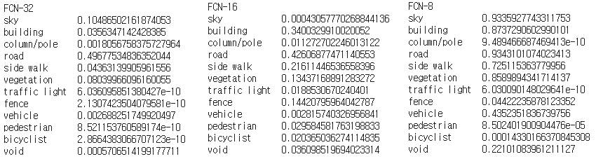 FCN-32와 FCN-16 모델은 학습이 크게 되지 않은 것으로 보이긴하지만, FCN-8보다 현저하게 해상도가 떨어지는 모습을 보여주고 있습니다. FCN-8의 경우에는 아주 정확하지는 않지만, 대체로 큼지막한 구역들은 정상적으로 구분하고 있습니다.