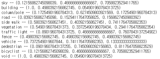 class_names = ['sky', 'building','column/pole', 'road', 'side walk', 'vegetation', 'traffic light', 'fence', 'vehicle', 'pedestrian', 'bicyclist', 'void']