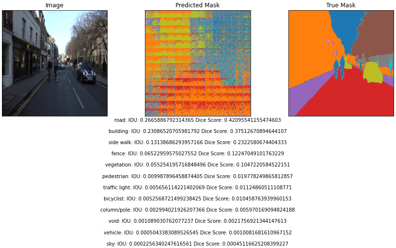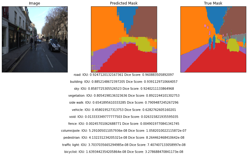 show_predictions(y_true_images[integer_slider], [results_fcn8[integer_slider], y_true_segments[integer_slider]], ["Image", "Predicted Mask", "True Mask"], iou_fcn8, dice_score_fcn8)