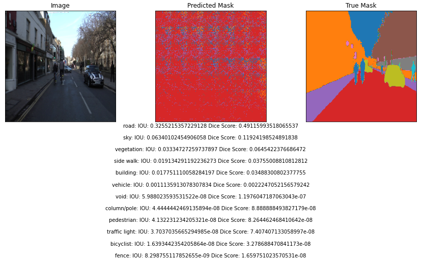 show_predictions(y_true_images[integer_slider], [results_fcn16[integer_slider], y_true_segments[integer_slider]], ["Image", "Predicted Mask", "True Mask"], iou_fcn16, dice_score_fcn16)
