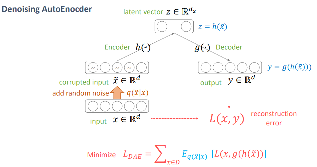 DAE는 구조는 일반적인 오토인코더와 동일하지만, 입력 데이터를 주입할 때 차이가 있습니다.